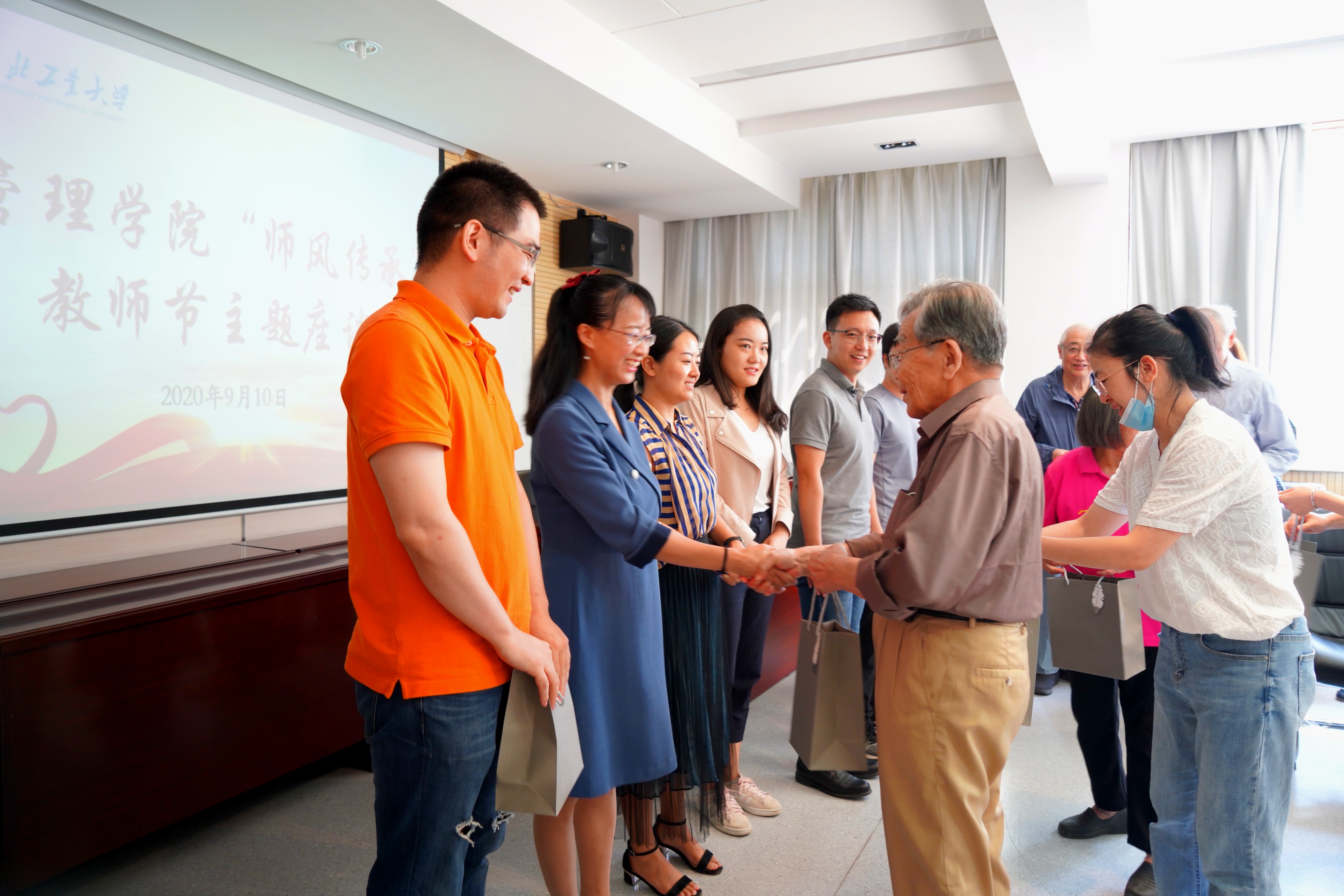 最后,青年教师代表向四位老教师献上鲜花,老教师也代表学院给全体青年教师赠送礼物。以激光笔喻戒尺、教鞭,既是传承教育之鞭也是鞭策上进之意。意在希望各位青年教师在接过这份育人之鞭后,能像老前辈一样,怀着一颗拳拳教育之心,继续为国、为校、为院发光发热。