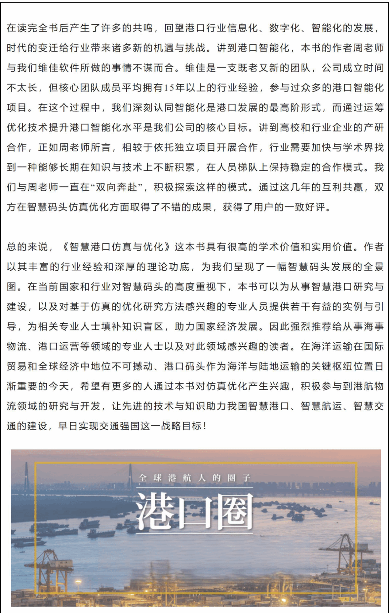 令人瞩目的是,这篇书评在发布后的12小时内阅读量已突破1200次。书评的作者郭育沛是烟台维佳软件科技有限公司总经理,也是港口物流信息化领域的资深专家。在他的领导下,该公司已成功实施并完善了多个集装箱码头的信息化和智能化建设项目。