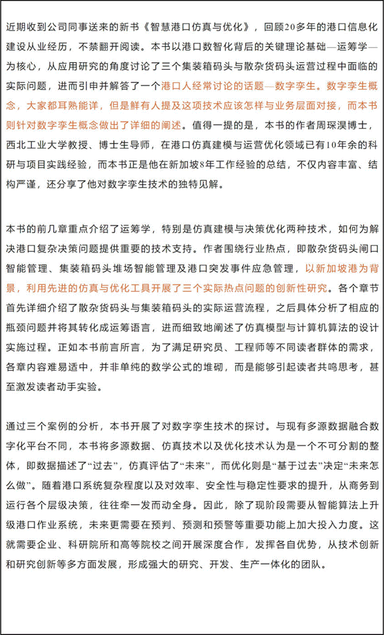 近日,“港口圈”公众号,行业内的权威媒体,推出了一篇深度书评,对《智慧港口仿真与优化》一书进行了全面解读。这本由周琛淏教授撰写的专著,集中展现了产学研协同创新在推动港口智慧化发展、行业技术进步等方面的重要作用。