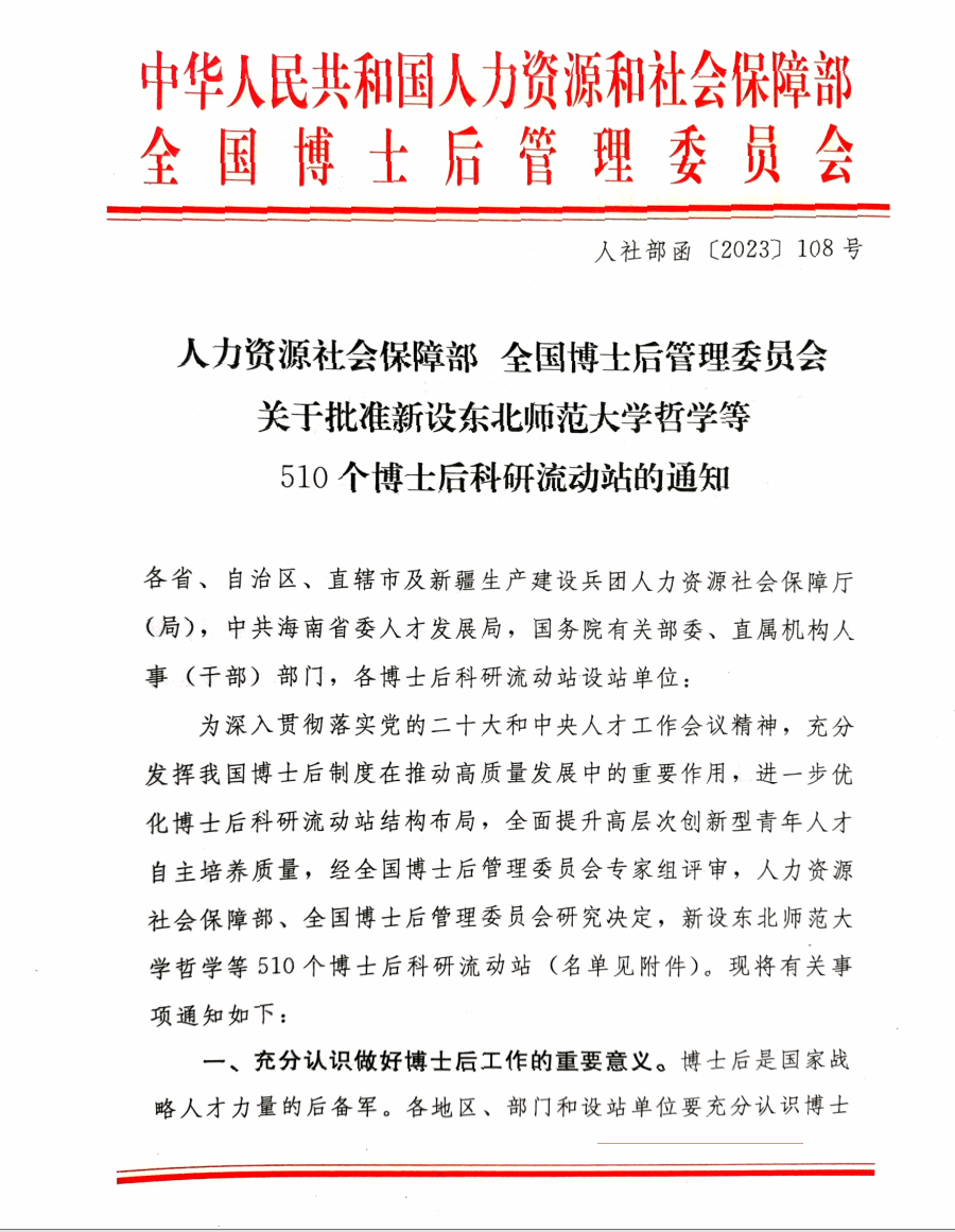 近日,人力资源和社会保障部、全国博士后管理委员会联合下发《关于批准设立东北师范大学哲学等510个博士后科研流动站的通知》(人社部函〔2023〕108号),磁力片