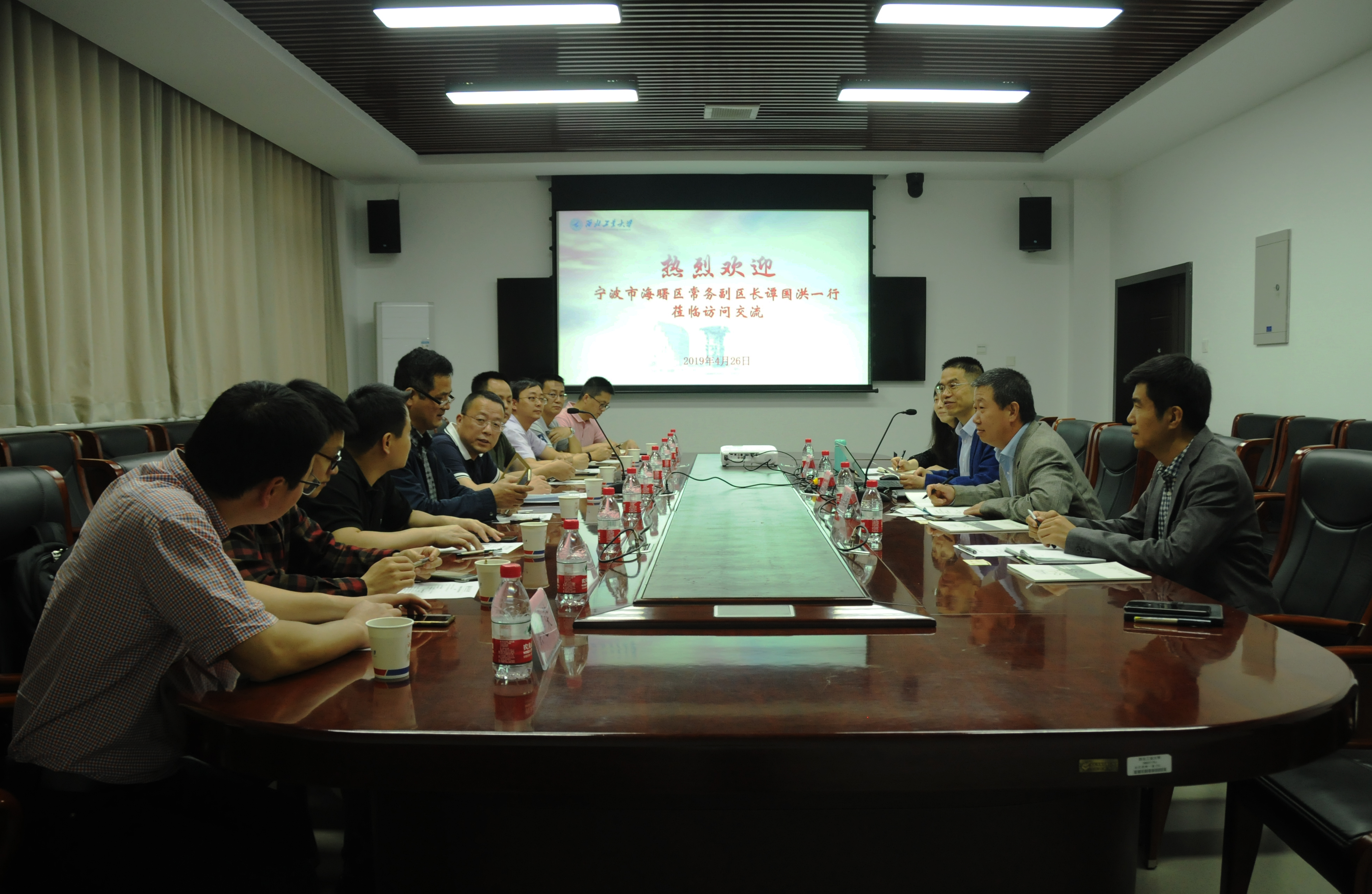 在与会人员收看了海曙区的宣传片后,谭国洪简单进行了补充介绍并说明了此行目的。他希望在国家军民融合战略大背景下找到一条与高校的合作之路,并表示了海曙区对引进人才的渴望。