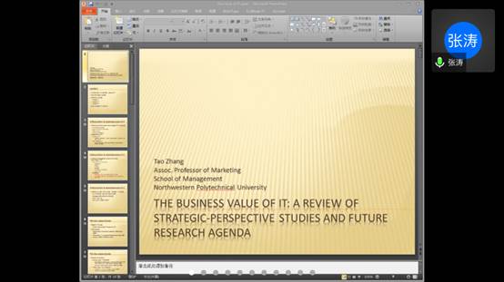 举行了《管理理论专题》系列报告第七讲。张涛副教授通过腾讯会议平台做了主题为“信息技术的商业价值:基于战略视角的研究回顾与未来研究方向”的报告。多位老师和修读博士生课程的博士生参与了本次线上学术讲座。