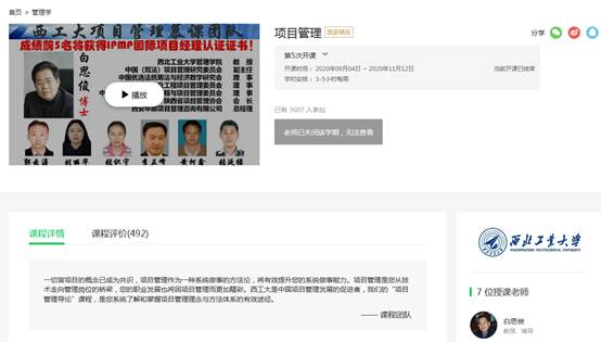 的学分认定课程,面向全校本科生在春、秋学期开放选课。线上教学占70%,侧重项目管理基本理论与方法的学习;线下教学占30%,突出项目管理实践案例的应用和开放式研讨,受到广大学生的欢迎。