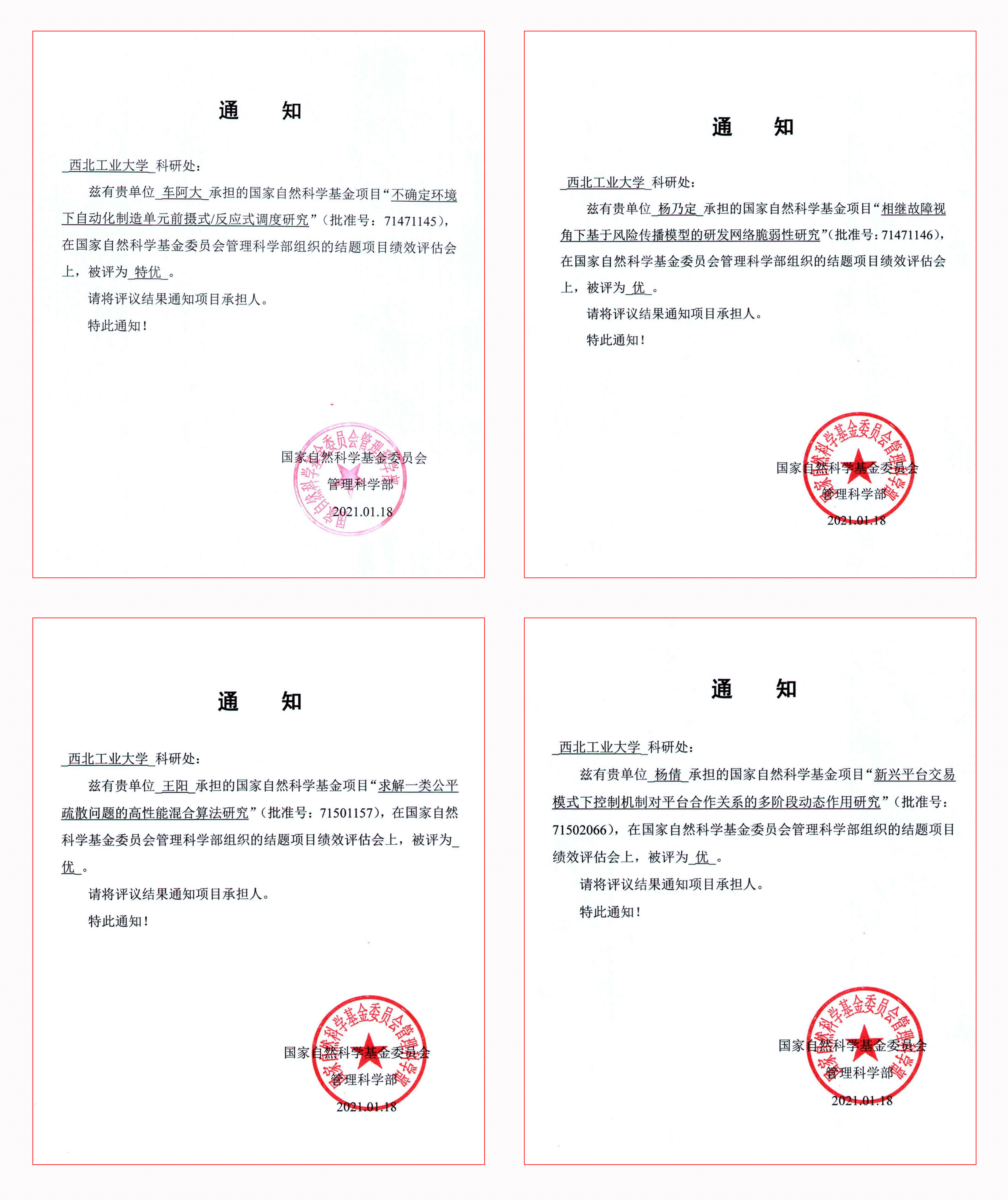 四项国家自然科学基金项目被评为特优、优秀。其中,车阿大教授承担的“不确定环境下自动化制造单元前摄式/反应式调度研究”被评为“特优”,杨乃定教授承担的“相继故障视角下基于风险传播模型的研发网络脆弱性研究”、王阳副教授承担的“求解一类公平疏散问题的高性能混合算法研究”和杨倩副教授承担的“新兴平台交易模式下控制机制对平台合作关系的多阶段动态作用研究”被评为“优秀”。
