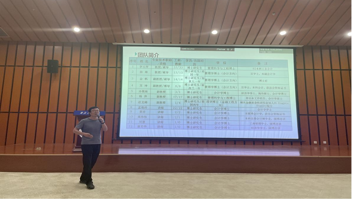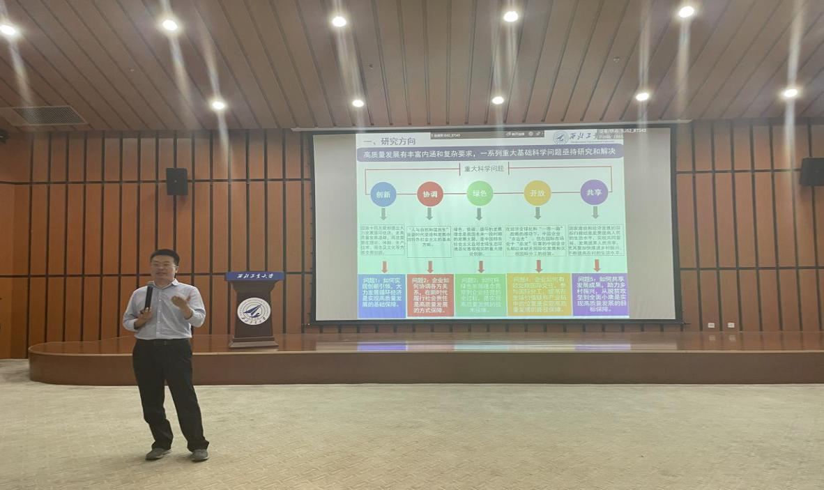宣讲开始,各科研团队主讲人依次上台宣讲。企业高质量发展团队的贾明教授提到,本团队主要研究企业社会责任、绿色生产、绿色信贷与绿色消费、海外高质量发展、商业向善与乡村振兴等领域的重大管理问题,并在国内、外产生重要学术影响力。