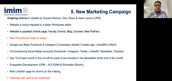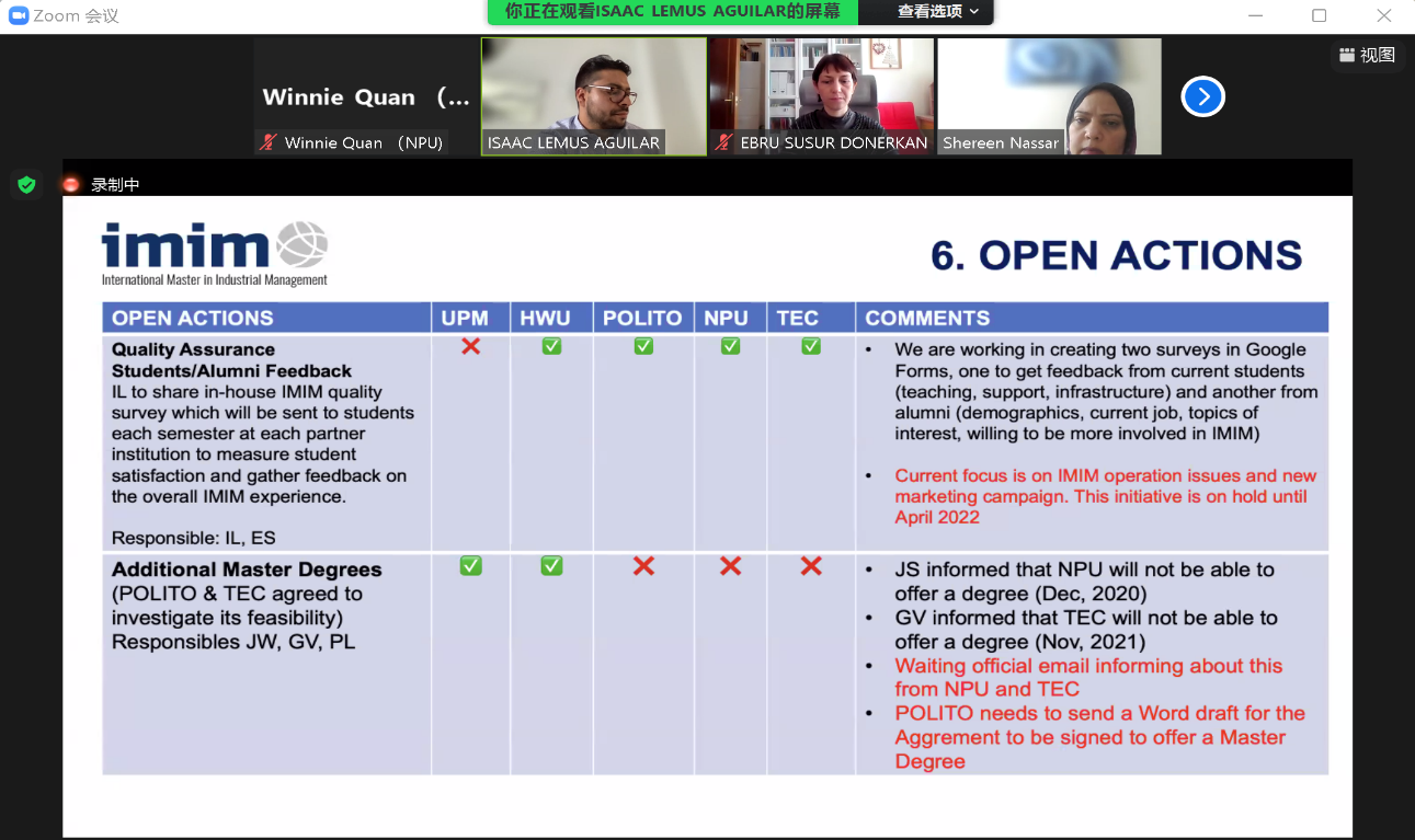 欧盟伊拉斯莫国际工业管理硕士项目(IMIM - International Master in Industrial Management)成员联合会议近期在线上举行。西班牙马德里理工大学代表Isaac Lemus、英国赫瑞瓦特大学代表Shereen Nassar、意大利都灵理工大学代表Paolo Landoni、墨西哥蒙特雷科技大学代表Gerardo Velasco以及磁力片 代表邵婧参加了此次会议。会议由Isaac Lemus主持。