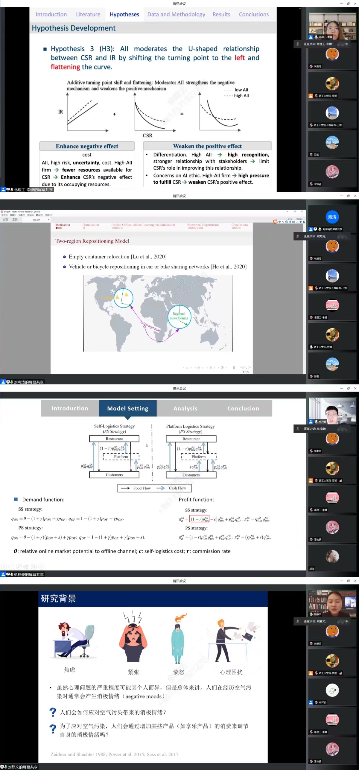 论坛以学术分享会开场,贾明首先对青年学者到来表达了诚挚欢迎,并分别对此次分论坛情况和四位学者作了简要介绍。受邀来校的北京理工大学李娜博士、新加坡国立大学刘海涛博士、哈尔滨工业大学刘静文博士和华南理工大学牟梓豪博士四位青年学者分别就企业履行社会责任是否会降低特质风险及运营效率与人工智能创新的作用、空气污染对享乐消费的影响——以电影行业的实证和实验研究为例、线下线上仿真的实时决策以及餐饮商家和外卖平台的配送合作模式研究展开了精彩的分享,并和与会的师生们展开了热烈的研讨。学院80余名青年教师和硕博研究生参加了本次学术分享会。
