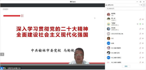 “学习宣传贯彻党的二十大精神”专家辅导报告迎来第二讲,邀请榆林市委党校马轮轮老师作专题辅导报告,学院全体师生党员参加了线上学习,报告由学院党委书记乔彩燕主持。