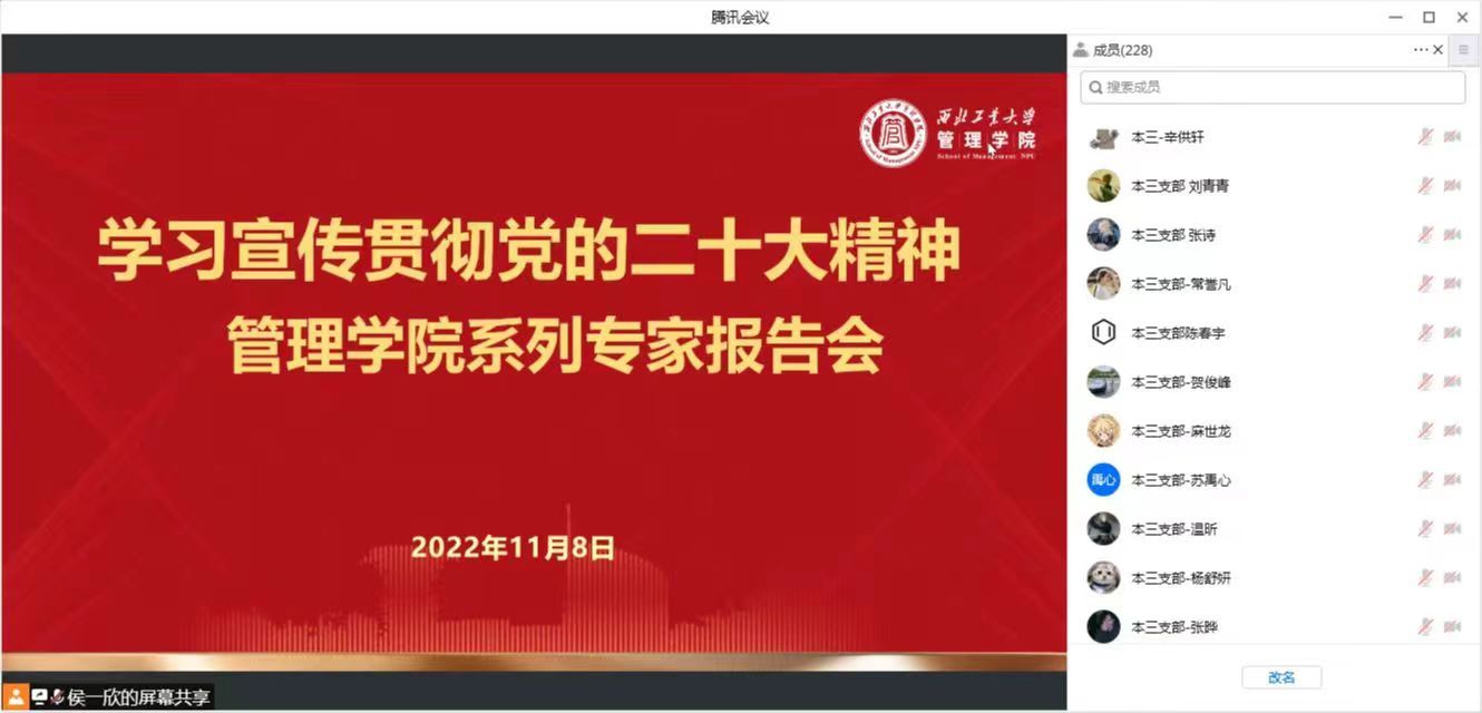 11月8日,磁力片 举行“学习宣传贯彻党的二十大精神”专家辅导报告第一期,邀请中共陕西省委党校侯建会教授作宣讲报告。学院全体师生党员参加了线上学习,报告由学院党委书记乔彩燕主持。