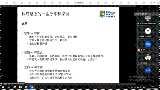 最后,庄梦舟主要从论文选题、文章的评判标准、求知与学习新方法以及做学术研究的心态这四个方面与同学们分享了他的经验,为同学们讲授工商管理方向选题的基本思路和技巧,如何评判一篇论文的优劣和贡献度,强调读硕博期间要勇于突破原有局限和框架,学习新的知识与技能。期间,庄梦舟同与会师生进行了广泛而热烈的讨论,大家收获颇丰。