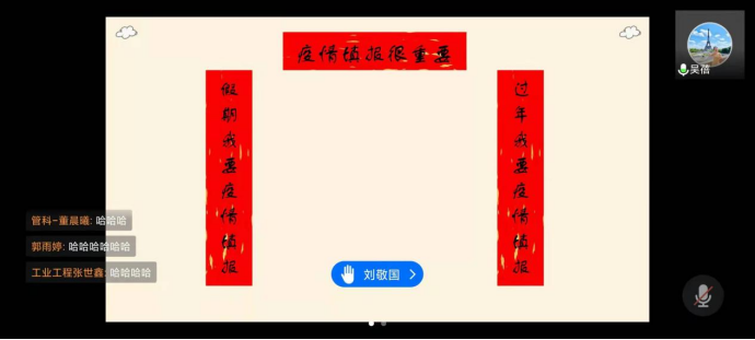 首先,吴蓓老师对近期安全稳定工作进行了总结,向同学们强调要注意消防安全、人身财产安全,再次讲解疫情防控下的请假规定。其次,吴蓓老师对假期离校工作进行了初步介绍,寒假正式放假时间是2022年1月7号,所有同学离校需按学校规定履行离校手续,告知导师,并在疫情填报系统上提交离校申请,同时填写在线离校留校登记表,提交假期离校承诺书等各项材料。另外,李玉婷同学介绍了即将开展的学院奖学金的注意事项,并向大家强调了寒假期间的疫情填报工作要日常化。