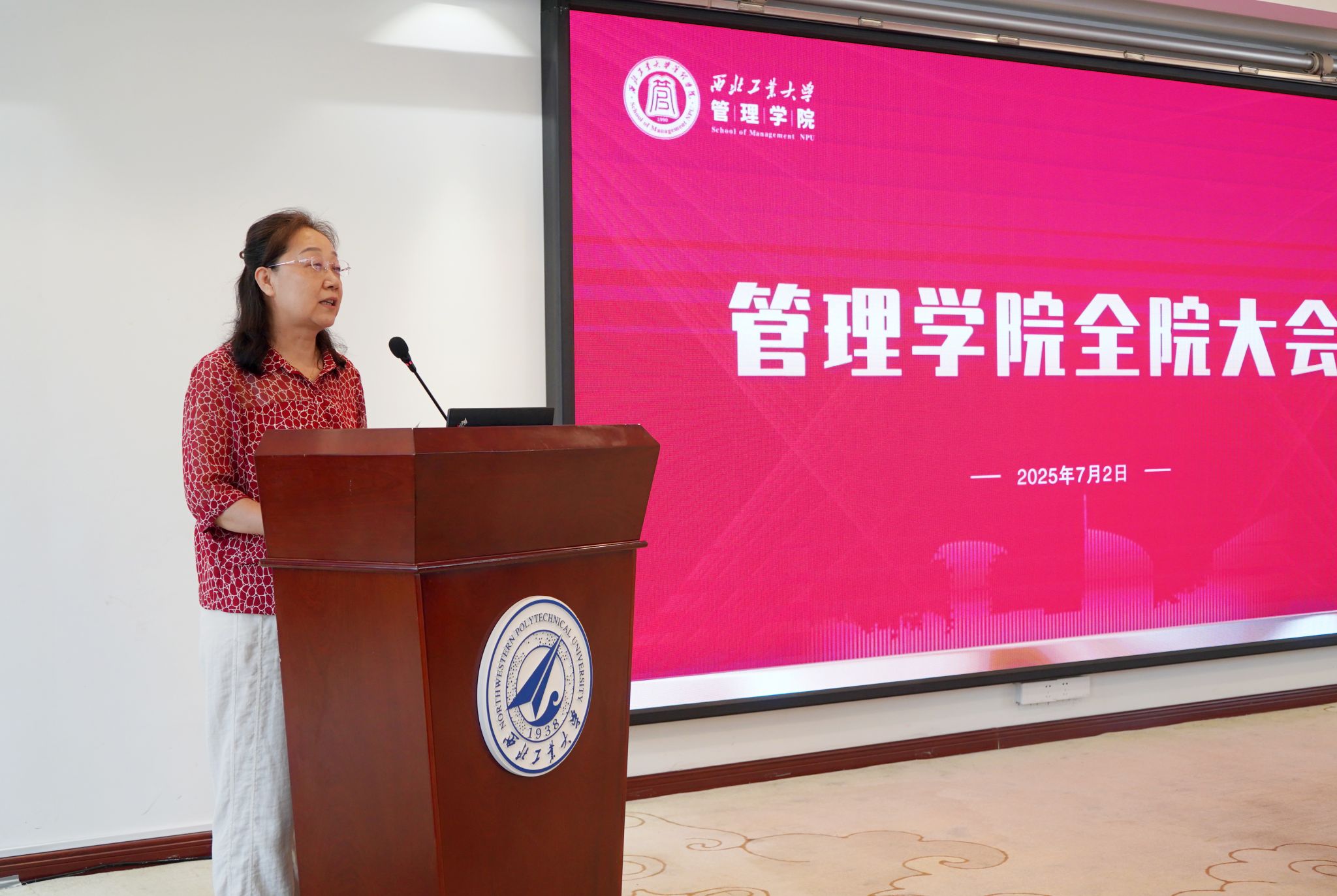 2025年春季学期全院教职工大会在正禾宾馆西四楼多功能厅召开。学院全体教职工参加,会议由学院党委书记张爽主持。