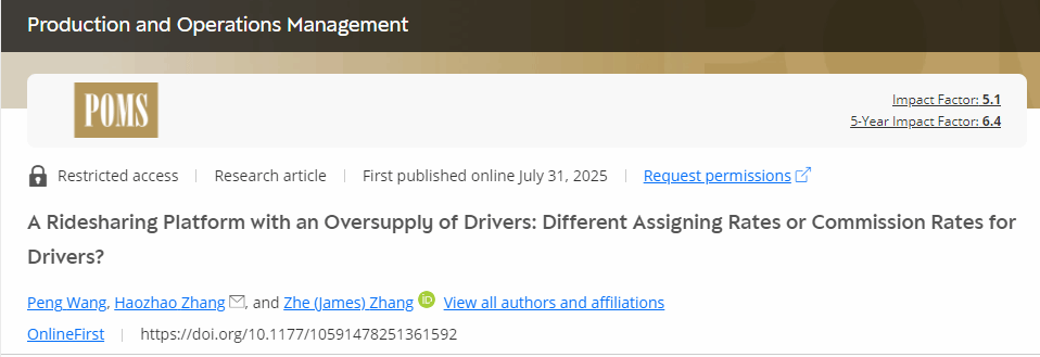 副教授王鹏与合作者的研究成果“A ridesharing platform with an oversupply of drivers: Different assigning rates or commission rates for drivers?”,王鹏为论文第一作者。《Production and Operations Management》是国际生产与运作管理协会会刊,为生产与运作管理领域顶级期刊,是美国University of Texas at Dallas选出的商学院最顶尖24种学术期刊(简称UTD-24)之一。