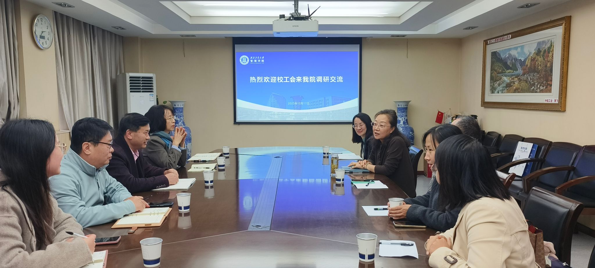 调研期间,校工会主席陈建军介绍了此次调研的目的,旨在进一步加强校工会与院工会之间的沟通联系,共同探讨新时期工会工作的模式与路径,切实推动院级工会组织建设与发展。会上,张爽代表学院对建军常务副主席一行表示热烈欢迎,对校工会一直以来给与学院的指导、支持与帮助,表示衷心感谢。蔡建峰就学院教代会常态化与工会工作规范化建设情况作了汇报。随后,与会人员围绕工会职能发挥、教代会制度建设、教职工思想动态等展开了深入的研讨