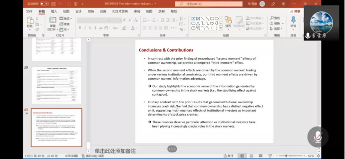 在此次讲座中,李青原教授首先讲述了同一行业的机构投资者的信息优势使得他们能够明确区分行业和公司的好坏消息,并且避免被假消息所蒙蔽以至于恐慌退出,进而减少股价崩盘风险。而后,李教授又借自己的研究强调了股票市场中共同所有者的经济价值以及信息优势所带来的稳定效应。研究分享结束后,李青原教授与学院师生进行了在线交流,分享了发表中英文顶级期刊论文的经验。