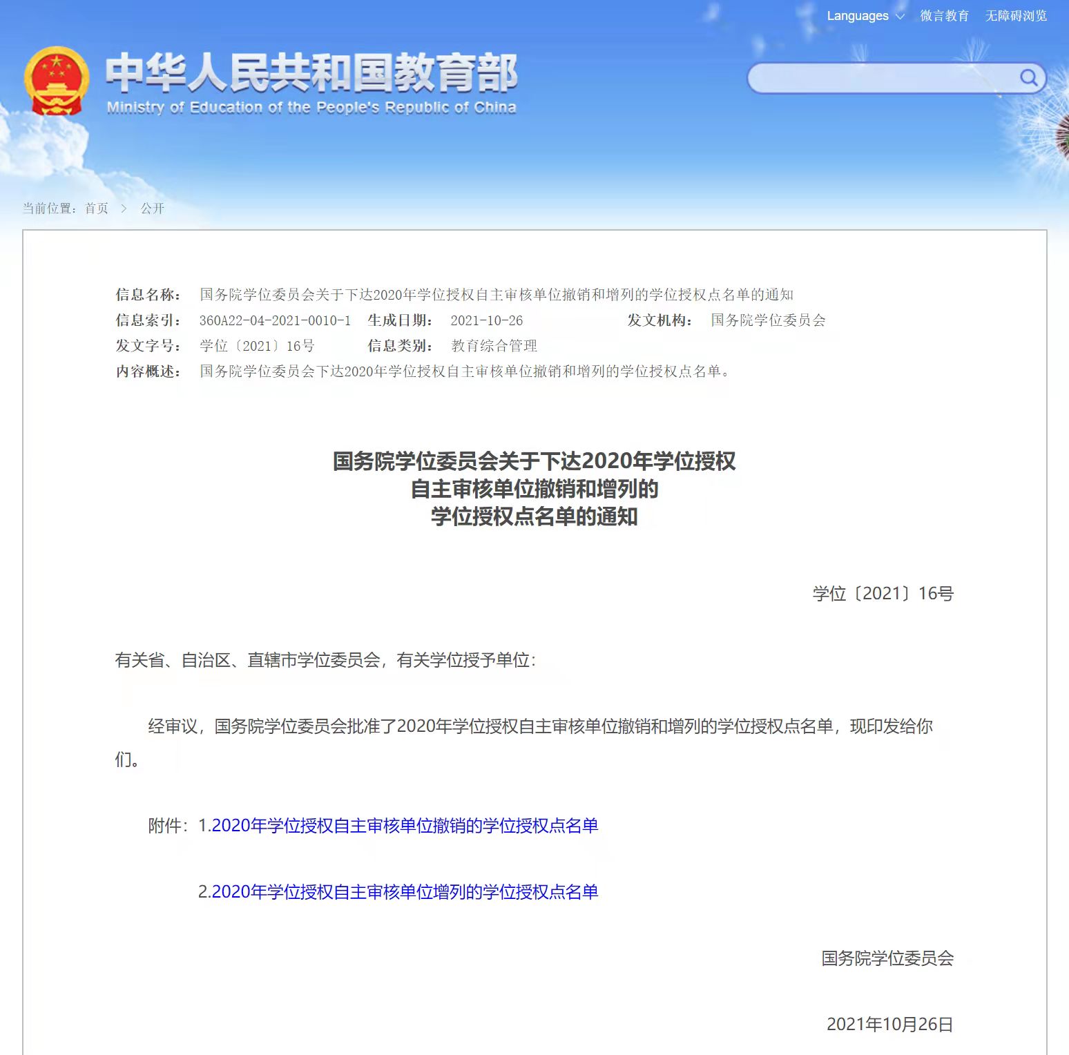 近日,国务院学位委员会印发《关于下达2020年学位授权自主审核单位撤销和增列的学位授权点名单的通知》(学位[2021]16号),经国务院学位委员会审议批准,磁力片