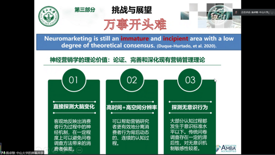 施卓敏教授结合自己和团队开展神经营销研究的历程和心得,分享了其利用眼动、脑电ERP等神经科学技术在消费行为学领域的探索经验。紧接着,施教授介绍了她与团队的研究成果,系统梳理了神经营销学当前的研究内容和观点,并指出了神经营销学研究热点和未来发展趋势。