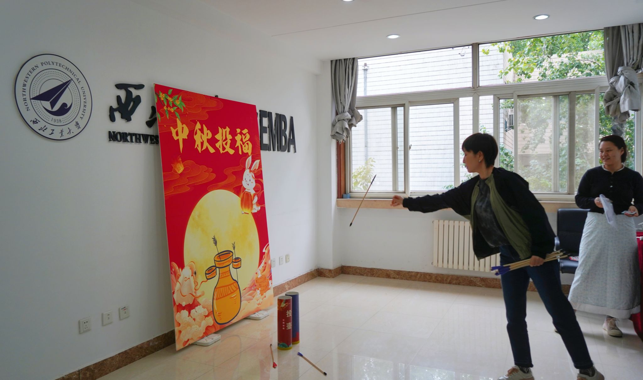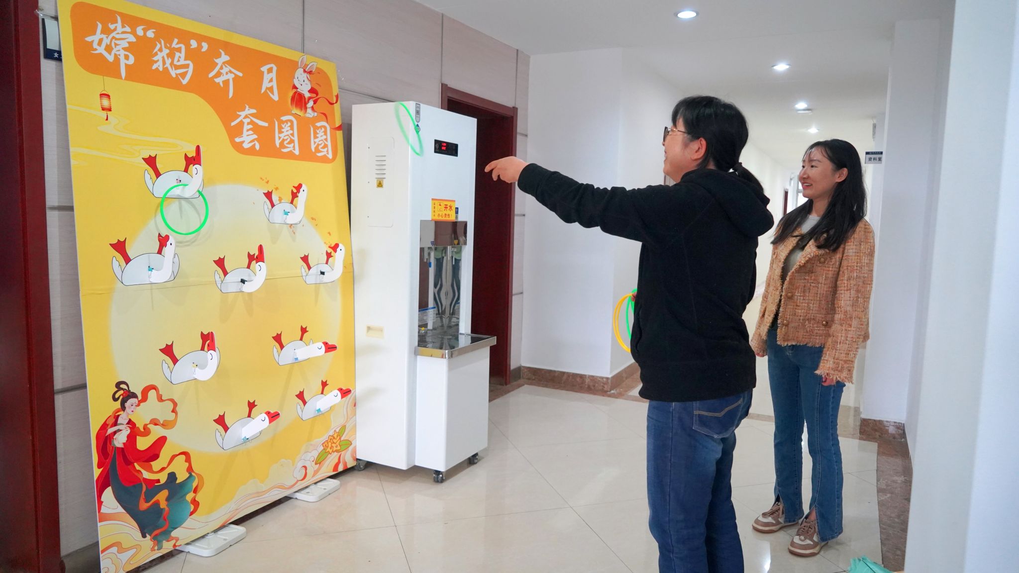 活动现场设置四大特色游戏区,处处洋溢着浓厚的中秋氛围。在中秋灯谜会区域,教职工们或独自思索,或结伴探讨,在解码传统文化谜题的过程中尽享乐趣;中秋投福游戏区前,大家手持箭矢在指定线外瞄准壶具投掷,箭矢投出时的专注与命中时的欢呼交织,每一次投掷都承载着对佳节的美好期许;嫦“鹅”奔月套圈区热闹非凡,大家或屈膝调整角度,或抬手瞄准投掷,现场笑声此起彼伏;钓花灯项目则考验手眼协调,教职工们手握纤细钓竿,小心翼翼对准花灯,时而屏息调整力度,时而快速提竿。整场活动中,大家在各个游戏间穿梭互动,现场洋溢着温馨欢乐的节日氛围。