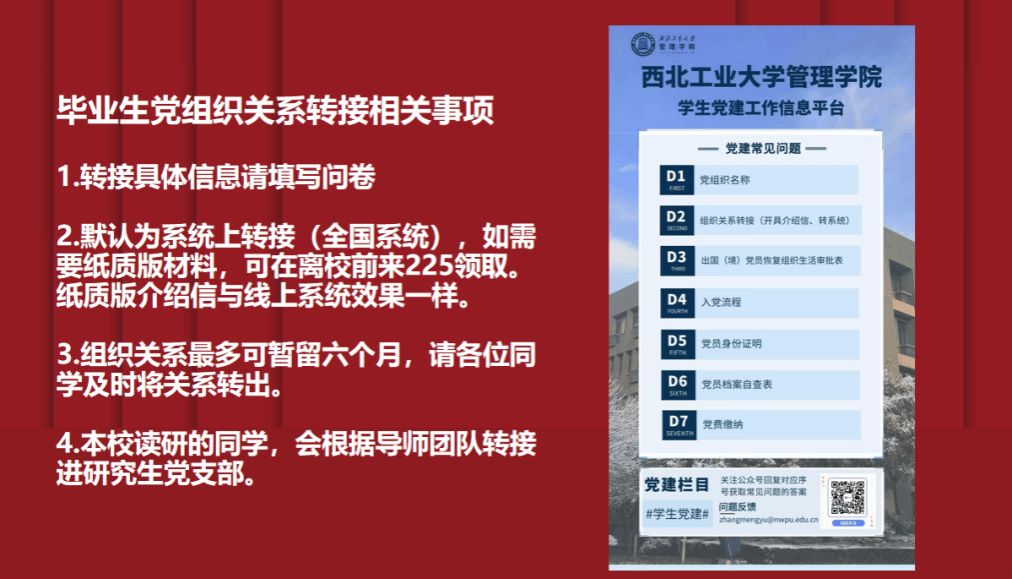 最后,学工秘书张梦予同志针对党关系和党员档案的转接要求、转接流程、常见问题及注意事项等进行了详细说明,以此保障每位毕业生党员组织关系顺利转接。