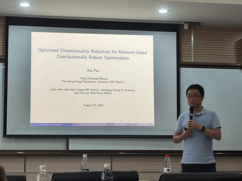 报告会期间,潘凯介绍了基于矩的分布鲁棒优化(DRO)框架,通过统计信息与传统优化方法的结合来对最坏情况的分布做出决策。尽管DRO问题可以转化为半定制编程(SDP)问题,但高维SDP计算仍面临挑战。为此,潘凯提出了一种创新的优化维度还原方法(ODR)。与现有方法不同,ODR通过缩减随机参数的维度,显著简化了问题,同时保持了解决方案的鲁棒性。最后,潘凯向师生们展示了ODR方法在新闻供应商问题中的优势,表明其在计算时间和解决方案质量上均优于现有方法。