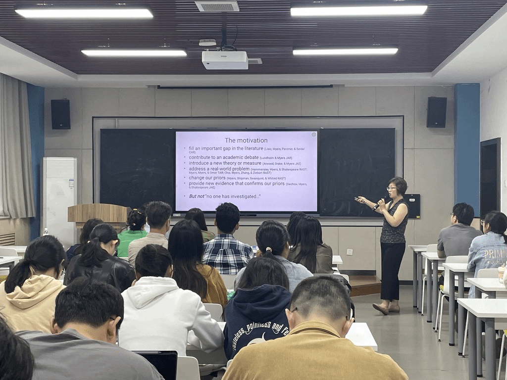 讲座最后,姜海燕与在座师生交流了如何撰写英文文章的引言部分,具体包括:引言目的、引言的重要性、引言格式、开始撰写时间、写作过程等方面。