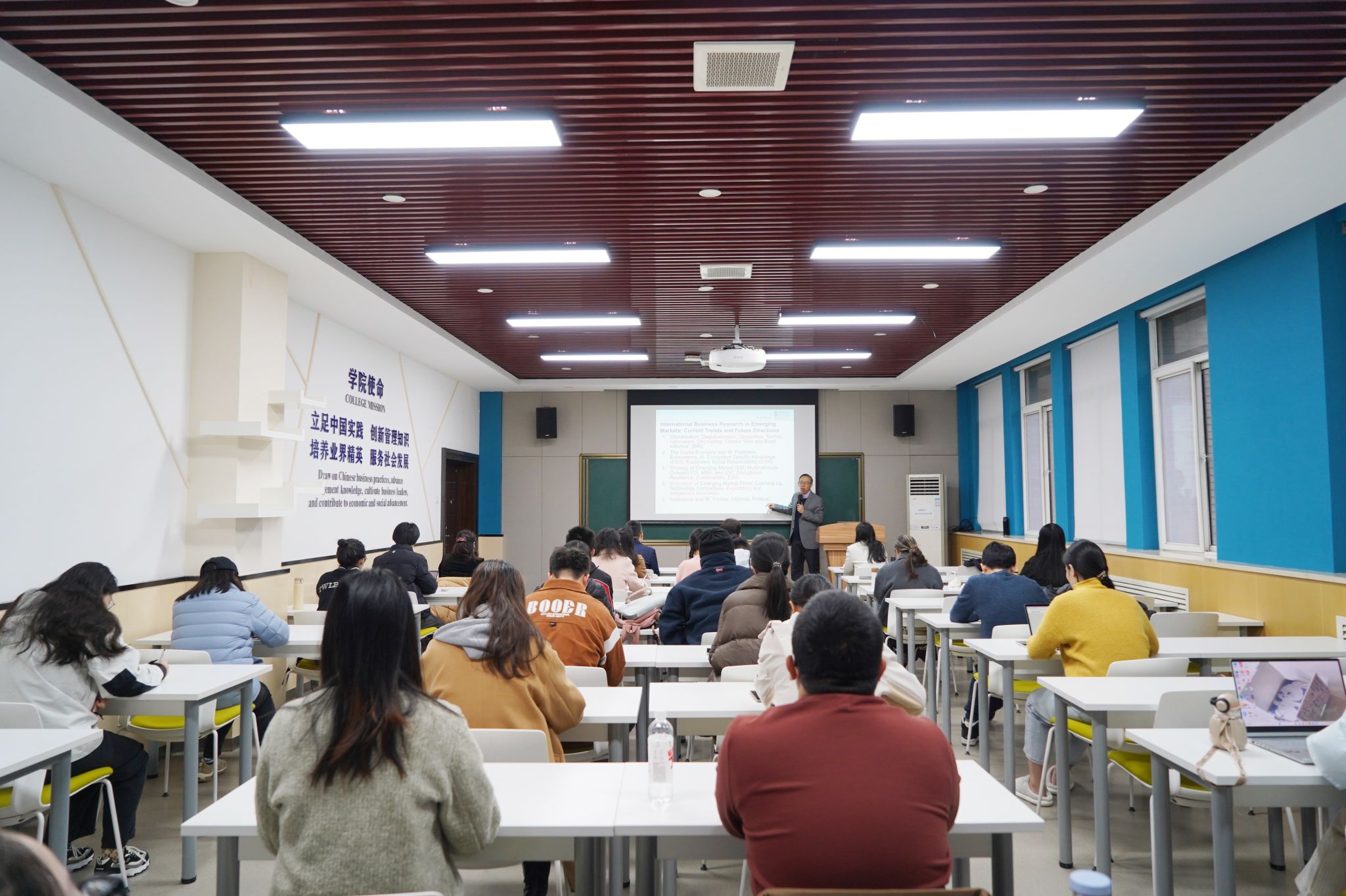 在此次报告中,李家涛深入阐述了新兴市场国际商务领域研究的当前趋势和未来方向;详细介绍了在国际顶级管理学期刊Journal of International Business Studies的五个特刊;强调了开展跨国公司韧性和可持续发展研究、海外投资研究及家族企业出海研究的重要性。在专题汇报中,李家涛表示,近年来,跨国公司在其经营的国家表现出不同的环境、社会和治理绩效。当跨国企业在监管更严格、规范压力更大的地区,其环境和治理绩效更好。在此背景下,研究聚焦跨国企业环境绩效,结果表明与东道国相比,跨国公司更有可能在母国实现碳减排,而跨国企业的长远导向和环境治理机制会有效缓解在母国和东道国的碳减排差距。
