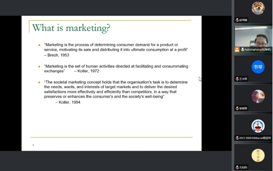 学生讲授了暑期课程《国际营销》。本次课程采用远程教学的方式进行,课程共分为4个部分,共计16个学时,全校多名本科生和研究生选修或旁听了本课程。