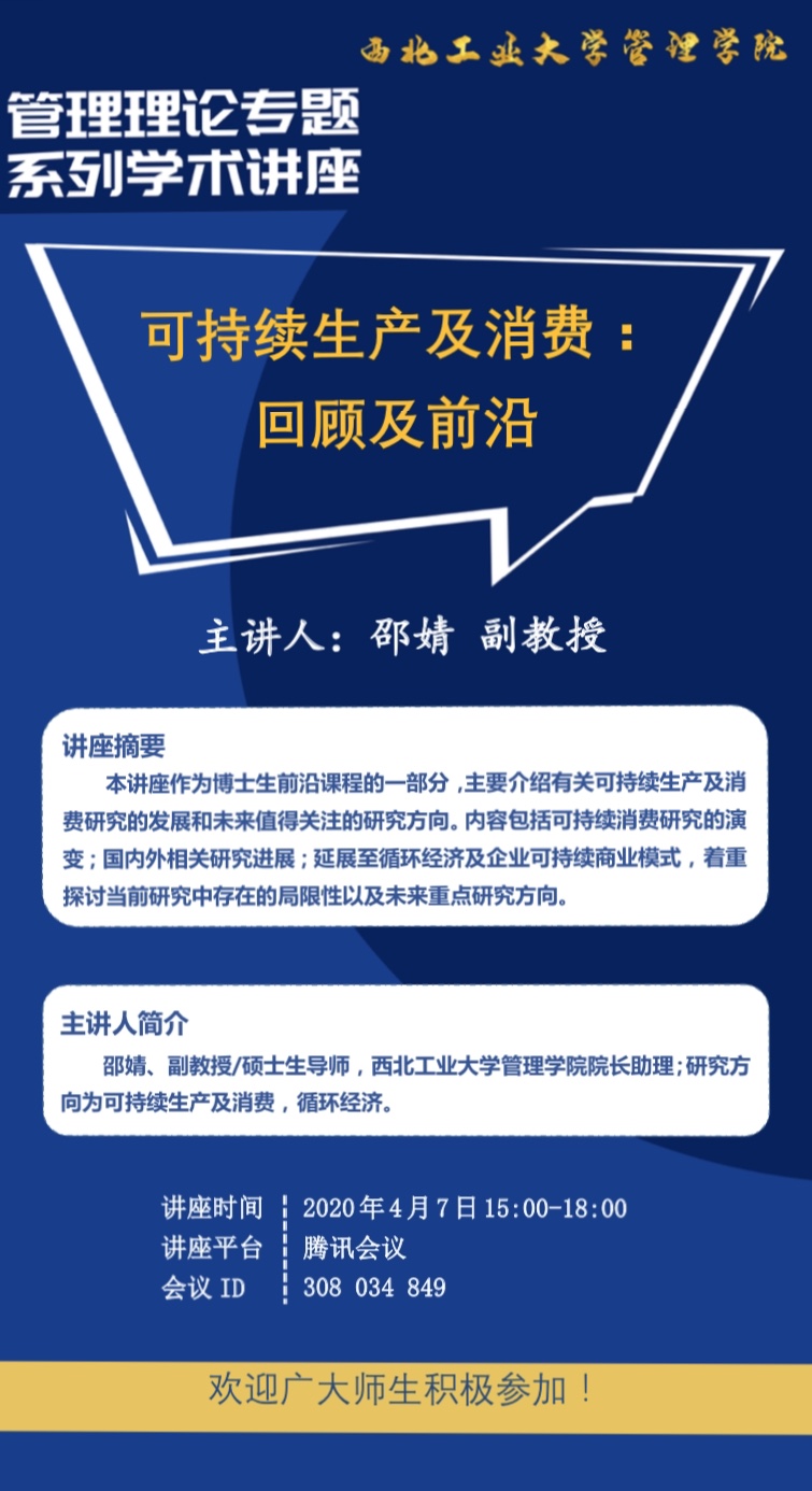 讲座摘要:本讲座作为博士生前沿课程的一部分,主要介绍有关可持续生产及消费研究的发展和未来值得关注的研究方向。内容包括可持续消费研究的演变;国内外相关研究进展;延展至循环经济及企业可持续商业模式,着重探讨当前研究中存在的局限性以及未来重点研究方向。