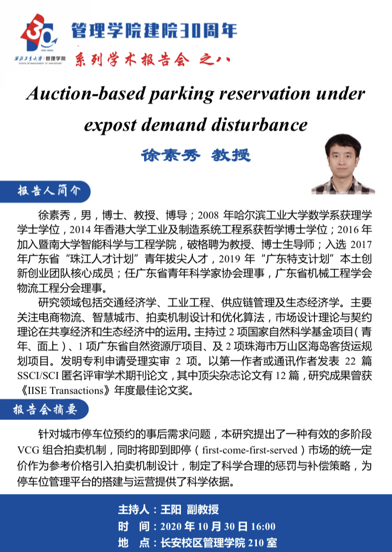 【磁力片 建院30周年系列学术报告会之八】Auction-based parking reservation under expost demand disturbance