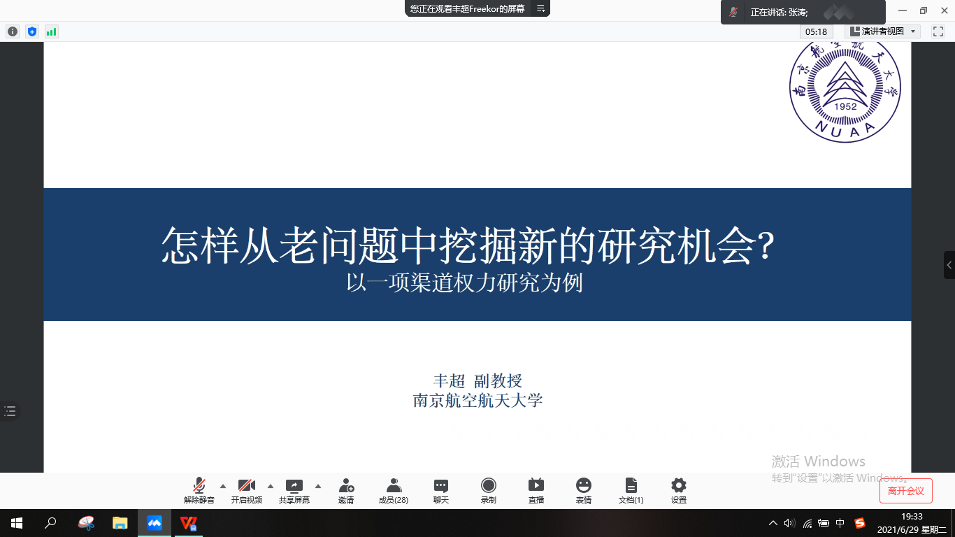 2021年6月29日晚上,南京航空航天大学副教授丰超老师做了题为“怎样从老问题中挖掘新的研究机会——以一项渠道权力研究为例”的报告。报告通过腾讯会议平台直播,由张涛副教授主持,磁力片