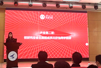 沈欣怡代表校研究生会致辞,她表示研究生会和学生代表们要筑牢信仰之基,勇于担当作为,加强研究生会组织建设、深化改革措施,把服务同学和服务学校发展落到实处。