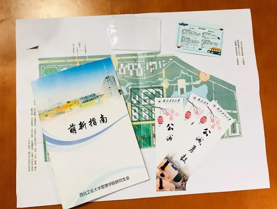 研究生会为新同学们准备了新生礼包,里面装有萌新指南、校园地图、校车时刻卡、书签、卡套等一些实用物品。