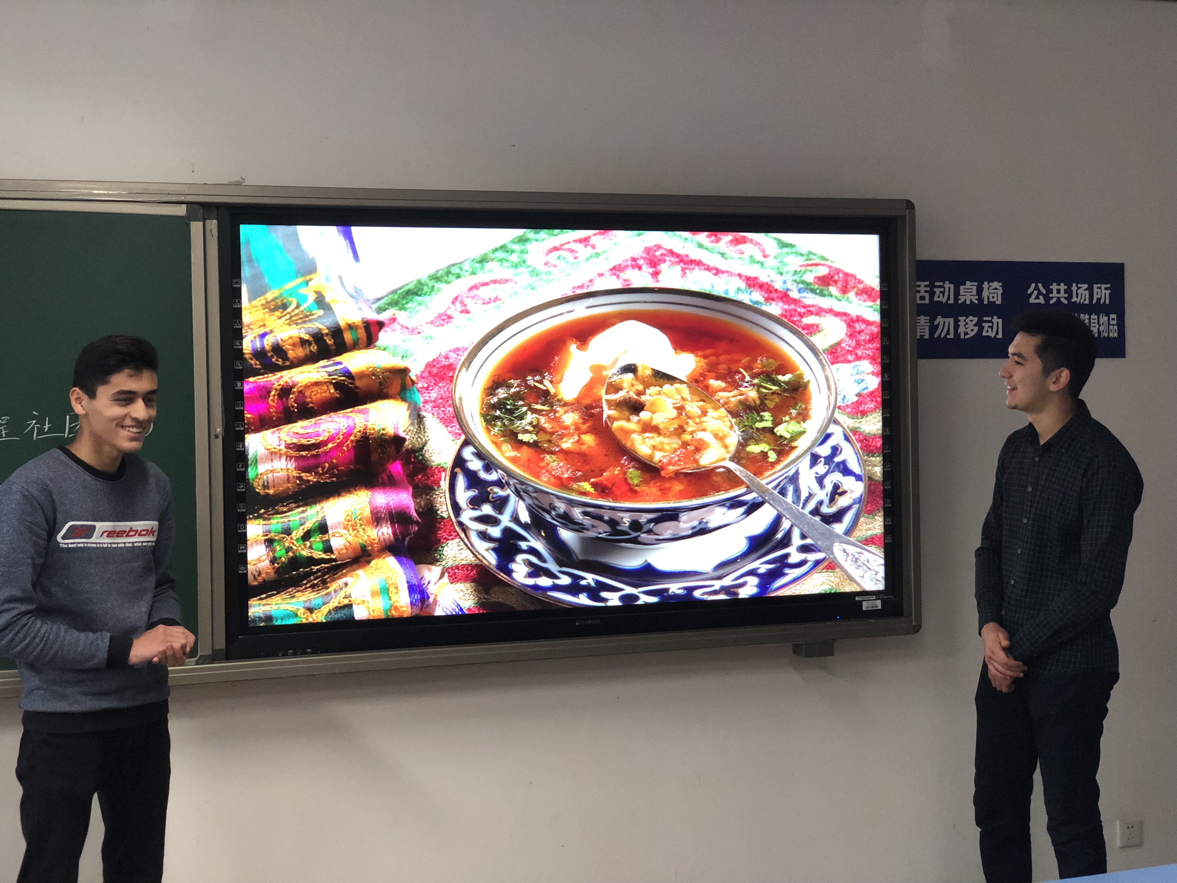 首先,来自乌兹别克斯坦的Bekhzod和Temur向同学们介绍了乌兹别克斯坦的风土人情。乌兹别克斯坦是一个自然风景和人文景观都很丰富的国家,此外,通过他们的介绍也使同学们感受到了这个国家人民的能歌善舞和心灵手巧。