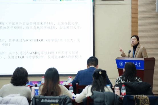 秦珞涵主任从对外经贸商学院国际认证的情况入手,介绍了对外经贸大学的认证情况,将三大国际认证进行异同点分析,对其侧重点与难点、认证时间经费与结果,及标准的区别进行全面进行讲解。她同时讲述了如何做好国际认证准备工作,帮助参会院校进一步了解现场访视的前期工作。