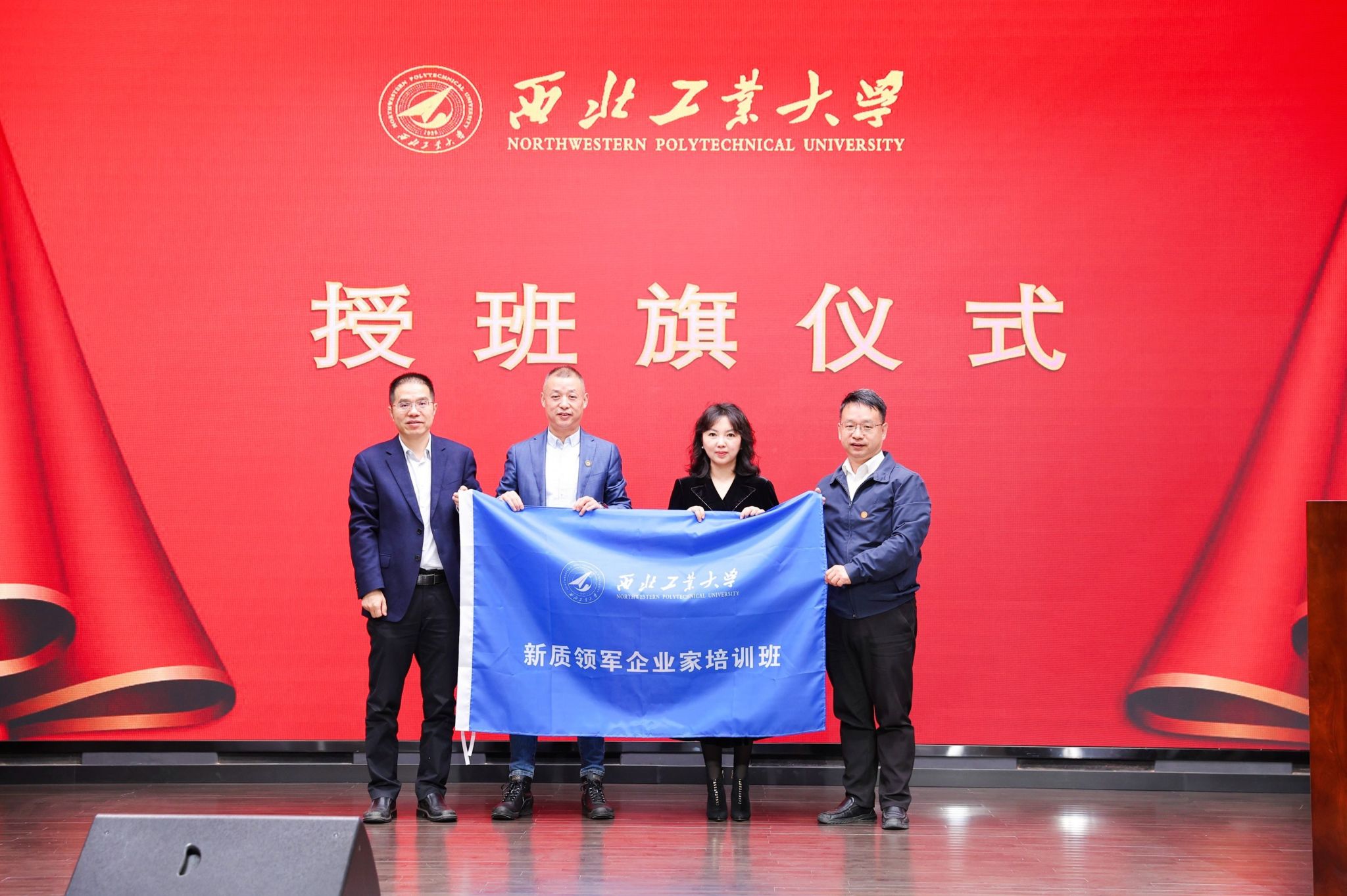 车阿大院长,西安校友会王方胜会长为新学员代表授班旗、佩戴校徽,秉承西工大校训弘扬校风,传承工匠精神和文化。