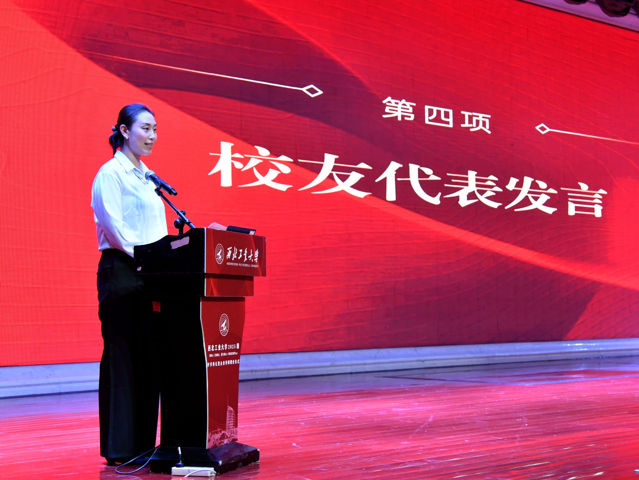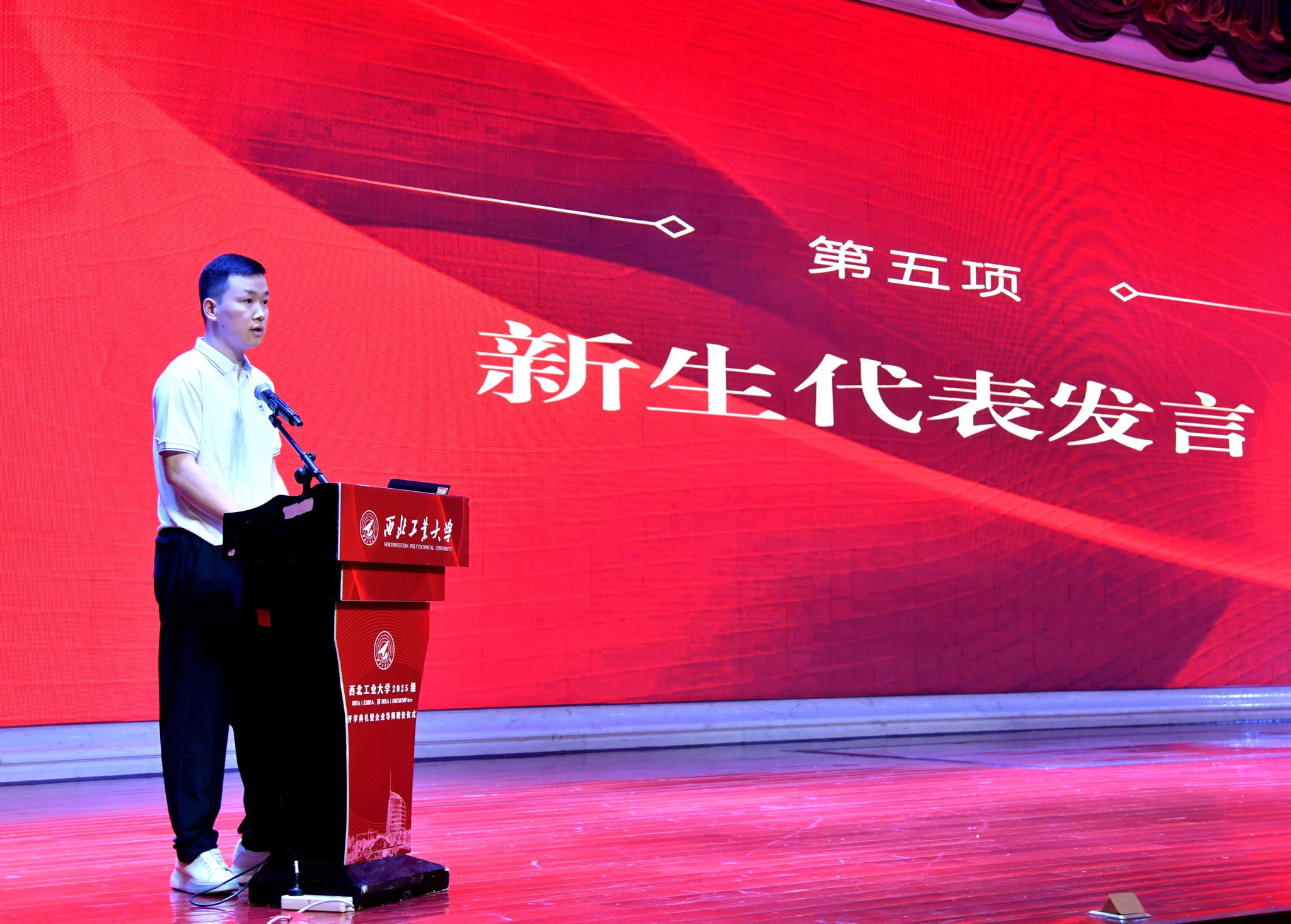 MBA新生代表、中国科学院西安光学精密机械研究所副主任设计师王磊,结合自身十余年参与地面靶场、航空航天类工程项目的经历,分享了“将个人奋斗融入国家需要”的深刻感悟。他表示,选择攻读MBA是为了提升体系化管理与战略规划能力,未来将与同学们在西工大互学共进,既做专业领域的“铸剑人”,更做新时代中国发展的“答卷人”。呼吁大家在这方充满机遇与挑战的天地里,镌刻属于我们的荣耀,为个人成长添彩,为国家发展助力!
