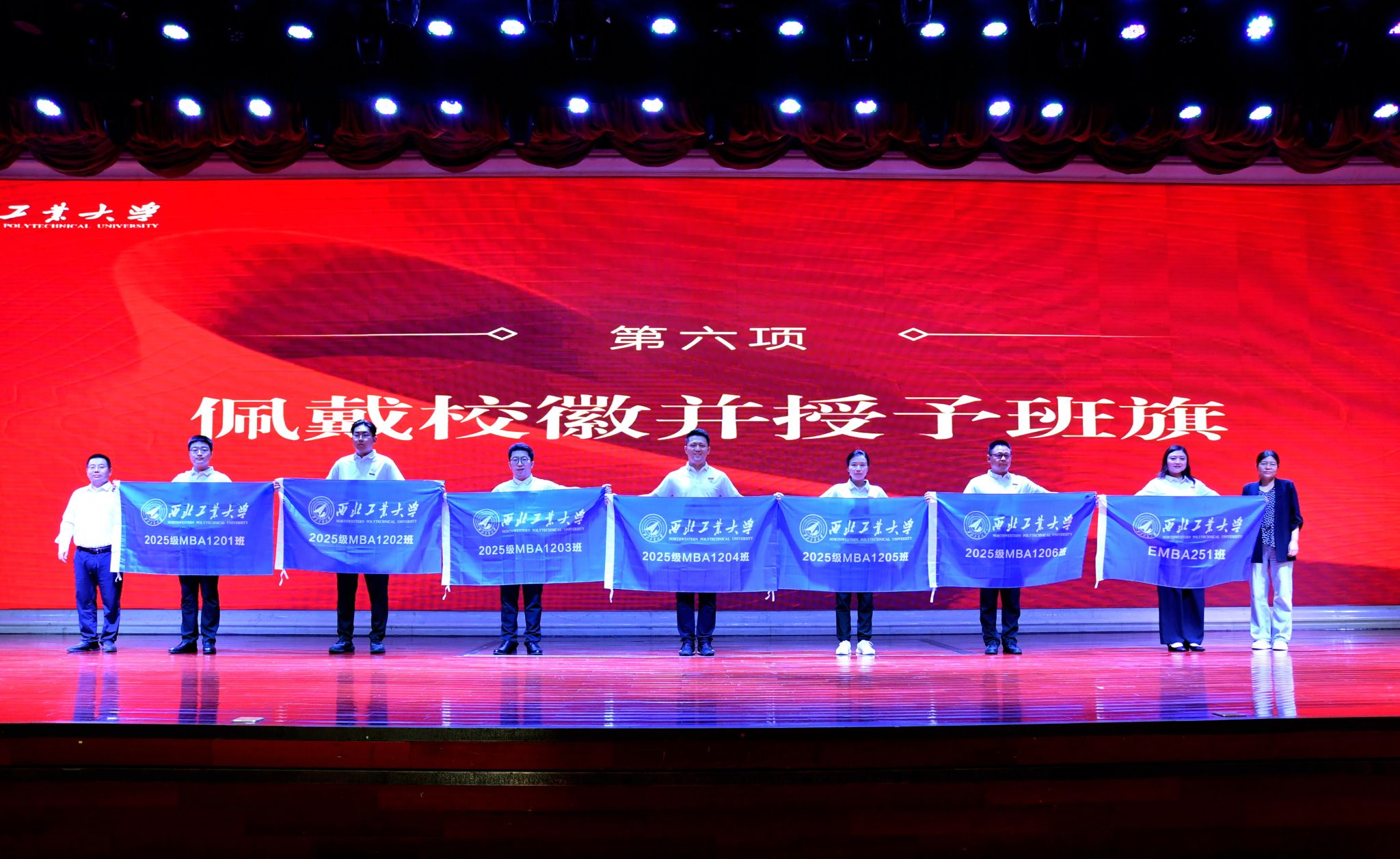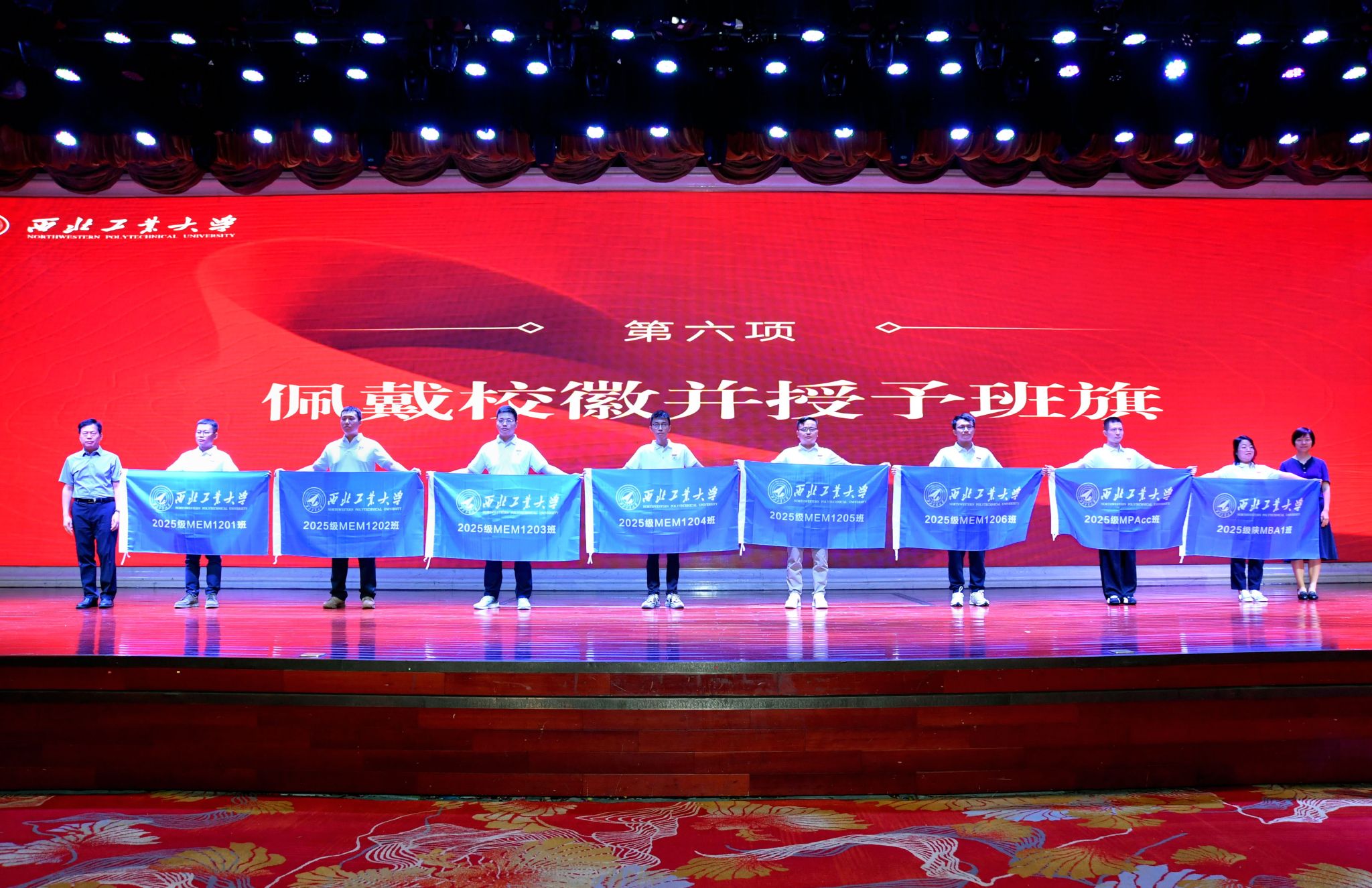 MBA/MEM教育中心主任杨宏玲、MPAcc教育中心主任金帆、MBA教育中心副主任肖平、MBA/MEM/MPAcc教育中心副主任黄媛为各班新生代表授予班旗。一面面班旗不仅是班级凝聚力的象征,更承载着学院对新生们“携手共进、逐梦前行”的期许。