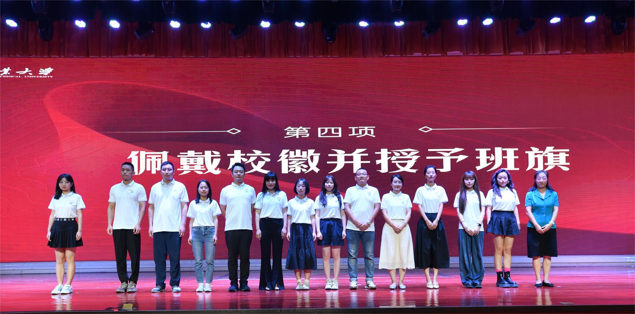 MBA/MEM教育中心主任杨宏玲、MBA教育中心副主任肖平、MBA/MEM/MPAcc教育中心副主任黄媛为各班新生代表授予班旗。