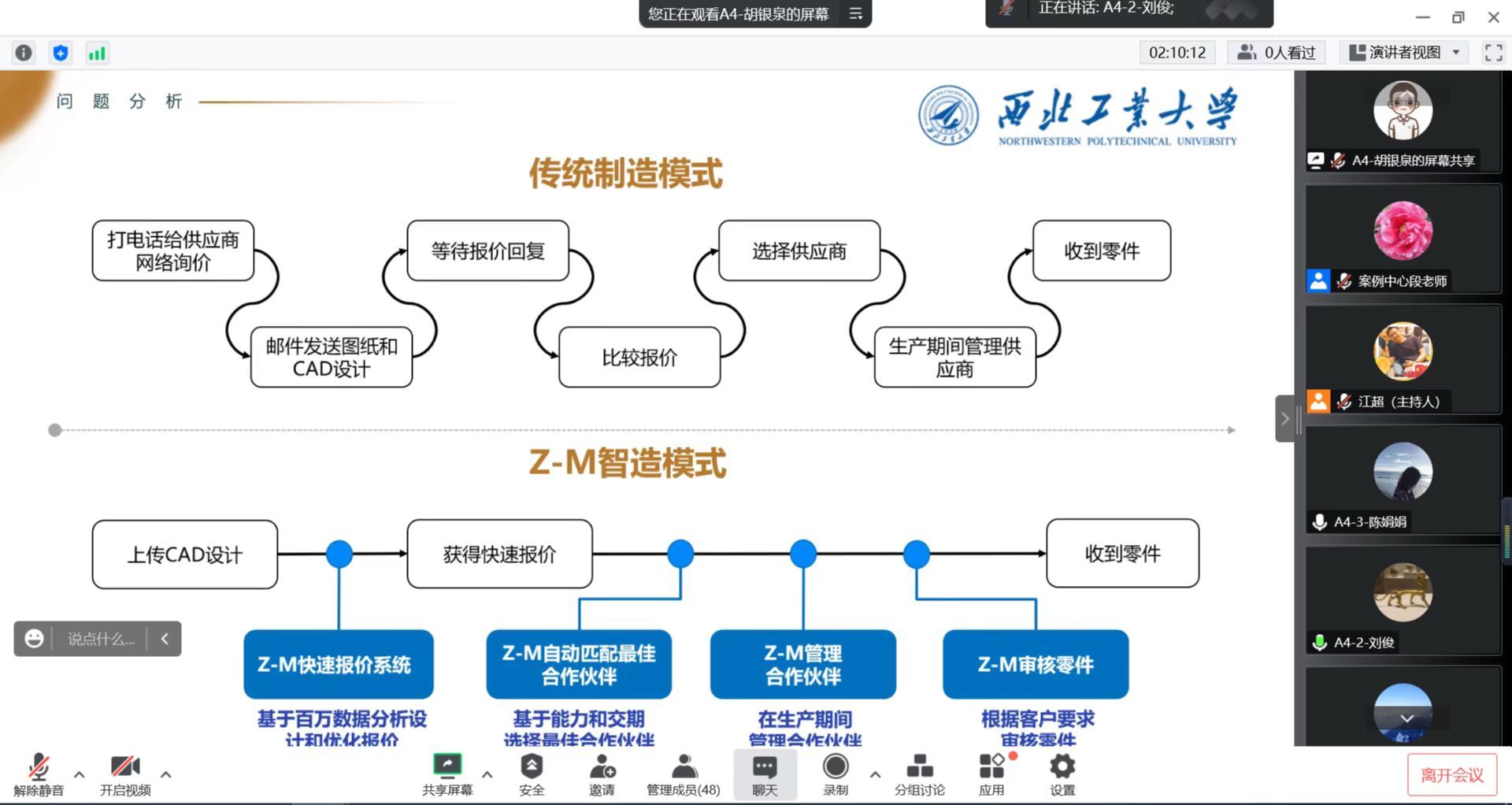 MEM案例大赛以线上方式顺利举行。本次大赛共有来自MEM专业学位的6支队伍参赛,学院管理案例研究与开发中心金帆主任参加了本次大赛。大赛特邀四川大学商学院梁学栋教授、天津大学管理与经济学部孟俊娜副教授和中航西飞民用飞机有限责任公司孙宝翔高级工程师担任评委,组长由梁学栋教授担任。