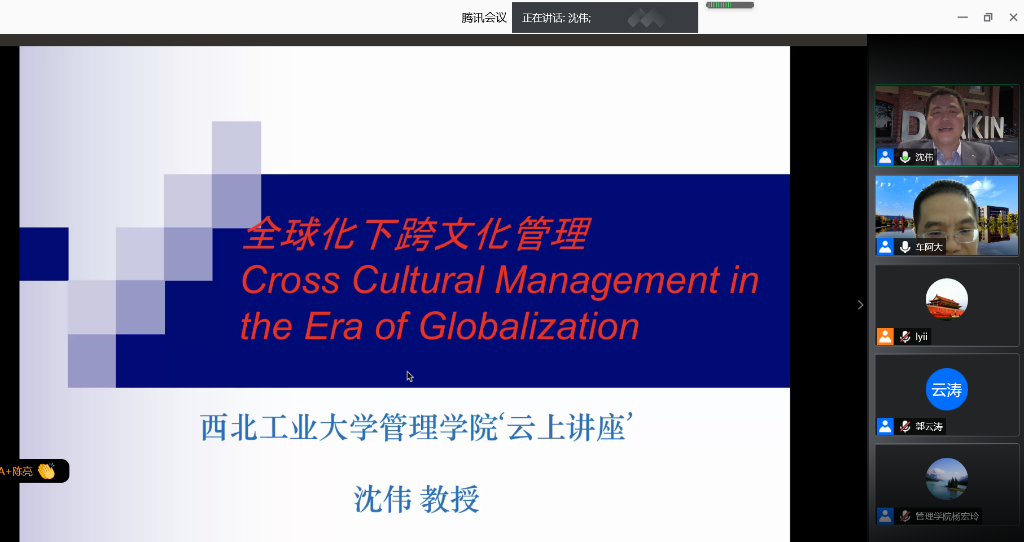 客座教授沈伟老师带来“云上讲座”--《全球化下的跨文化管理》。讲座通过腾讯会议平台直播,由车阿大院长主持,2020级专业学位研究生共计325人线上聆听了讲座。