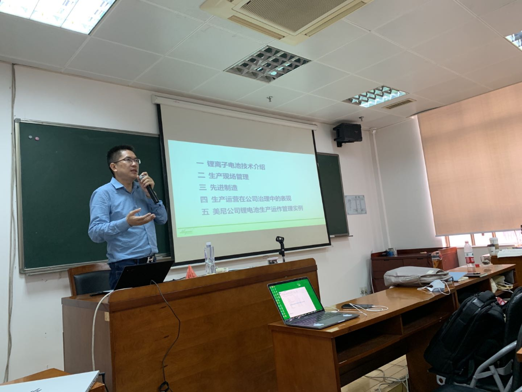 企业导师广东美尼科技董事长卢灿生先生受邀进入课堂,给同学们做了《锂电池生产运作管理》的课程内容分享。