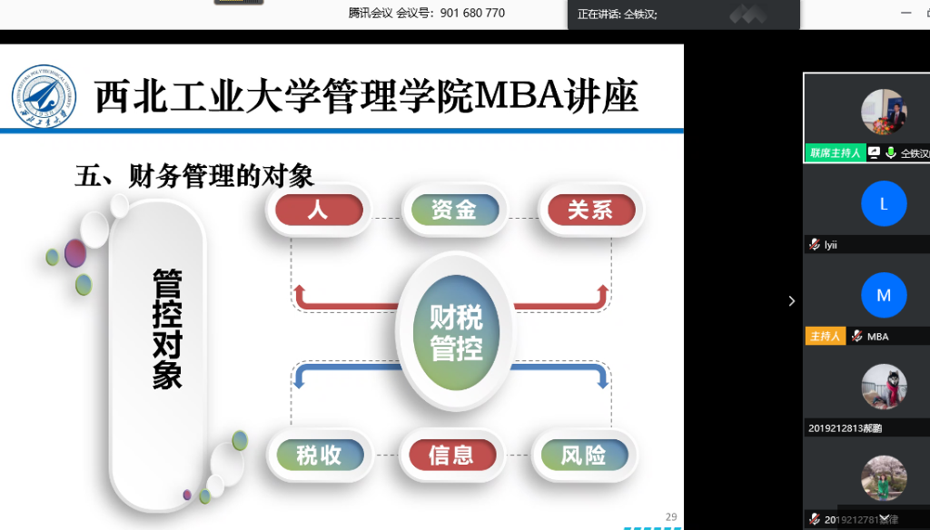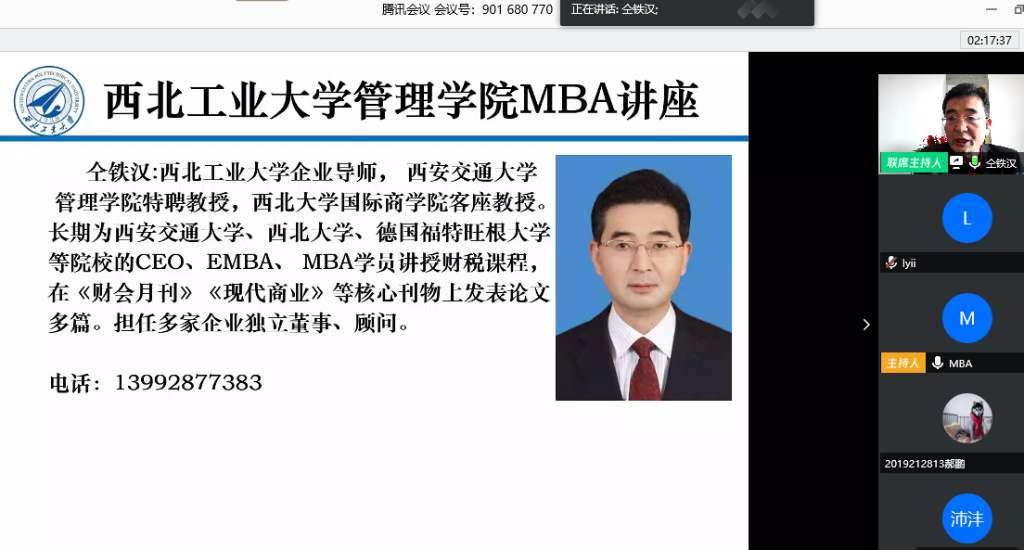 特邀企业导师仝铁汉教授带来首场“云上讲座”---《疫情防控时期企业财务管控方略》,讲座通过腾讯会议平台直播,由陈琳教授主持,2019级专业学位研究生MBA、MEM、MPAcc共计226人线上聆听了讲座。