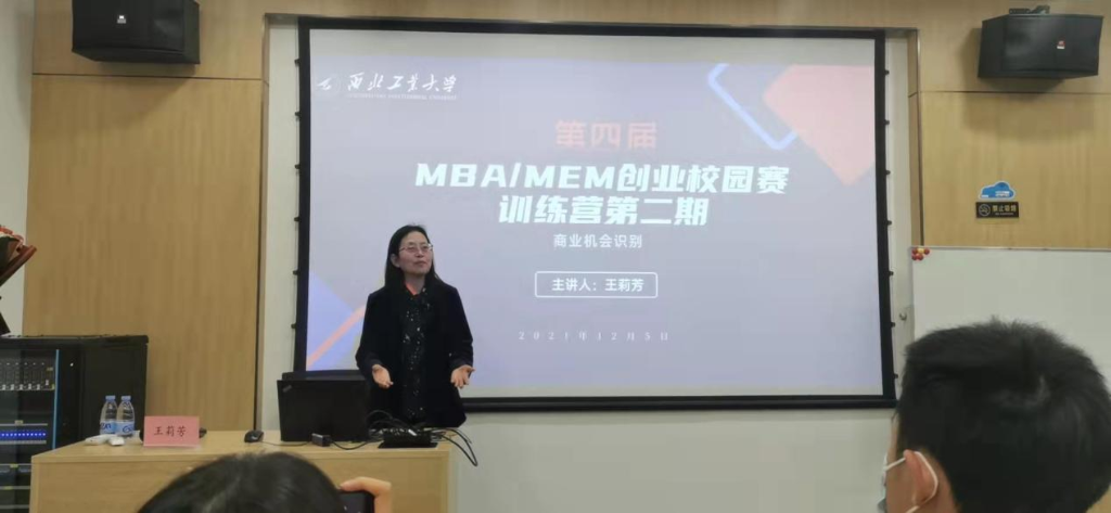 王莉芳教授在三航大厦六层勇字厅,以《商业机会识别》为主题开启了第四届MBA/MEM创业大赛校园赛“训练营”的培训。