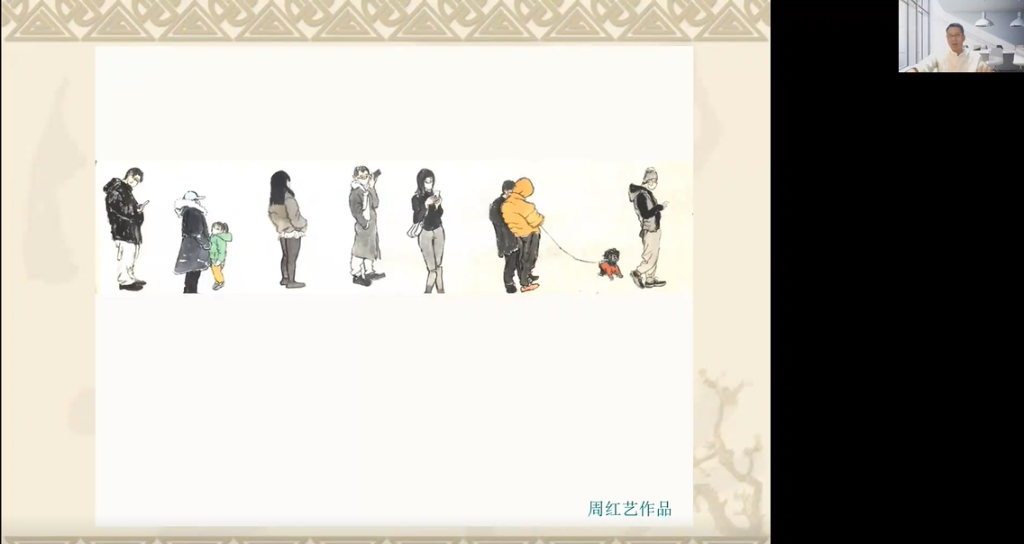 西安疫情时期,周老师不仅到抗疫一线去做核酸检测志愿者,而且用绘画来记录这特殊的时期。他创作了《等待》和《人间烟火》系列作品,让大家体会作品源于平常中的不凡,源于均衡时的灵动。周老师讲得生动,同学们听得投入,原计划两小时的讲座,延到三个多小时,结束时聊天区弹出密密麻麻的感谢和感想,好像一曲交响乐终了时雷鸣般的掌声。