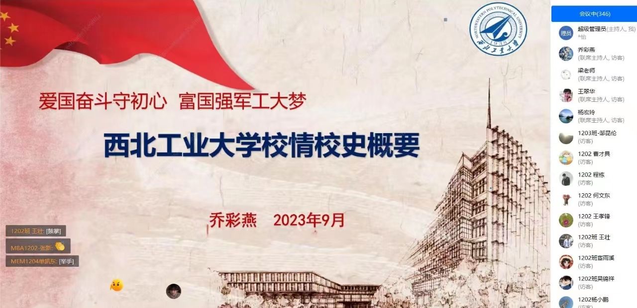 党委书记乔彩燕为2023级新生做题为《爱国奋斗守初心--校情校史与院情院史》的讲座。2023级非全日制专业学位MBA(EMBA)/陕MBA/MEM/MPAcc全体新生线上聆听了讲座。