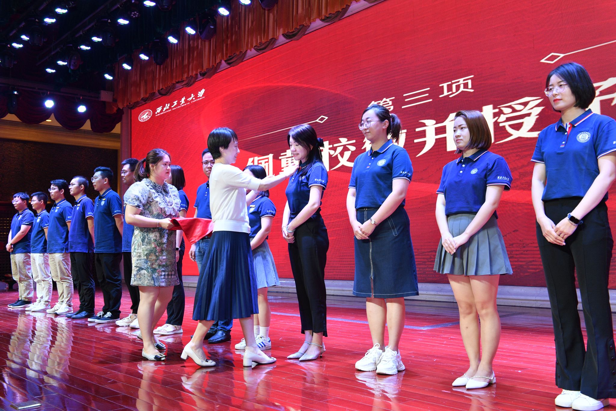 典礼上,党委书记乔彩燕为新生代表佩戴磁力片 校徽。