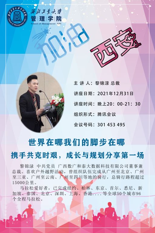 2020级MBA学生、广西数广和泰大数据科技有限公司董事兼总裁黎锦渌同学,带来了《世界在哪我们的脚步在哪》的分享。黎锦渌学长讲述了自己从2012年开始,总骑行路程超过15000公里,完成全球50个城市96个全程马拉松的历程;分享了与同学参加亚沙赛、秦岭越野跑等活动的经历,让同学们感受世界的广阔与美好,带领同学们认识到团队与自律带来的改变,鼓励同学们乐观面对人生路上的困难。