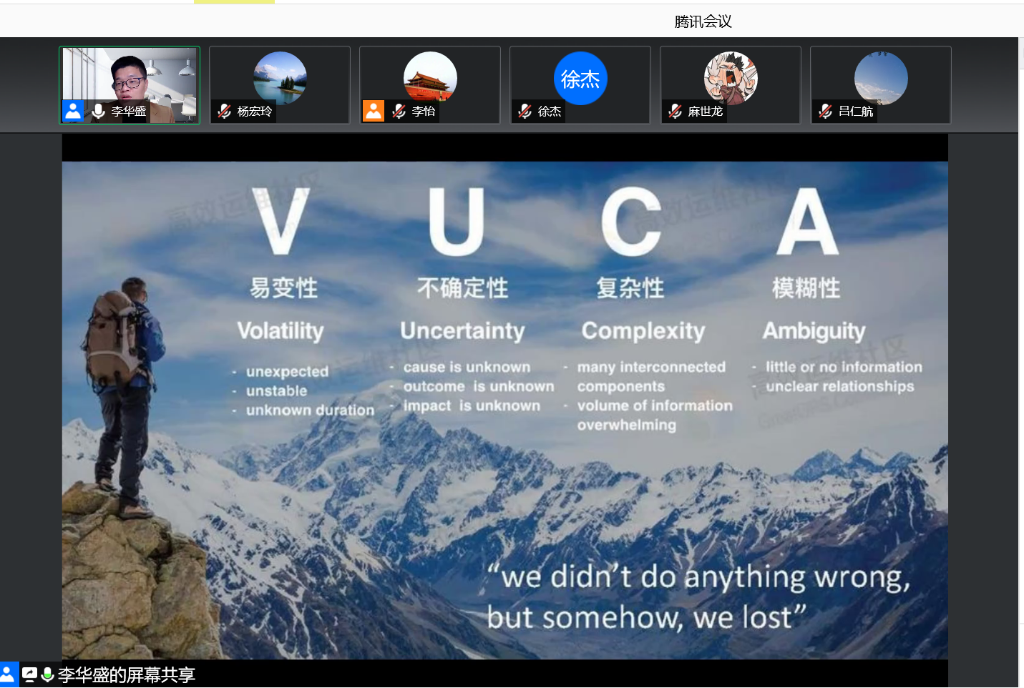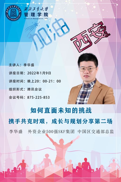 2020级MBA学生、500强企业SKF集团中国区交通部总监李华盛同学,带来了《如何直面未知的挑战》的分享。李华盛学长结合自己的亲身经历,向同学们讲述了如何在这个充满变化的VUCA时代做好迎接变化的准备,他从接受变化更新自己、识别变化、保持好奇心、面对失败、躬身自省等方面,给同学们给出了具体的建议。