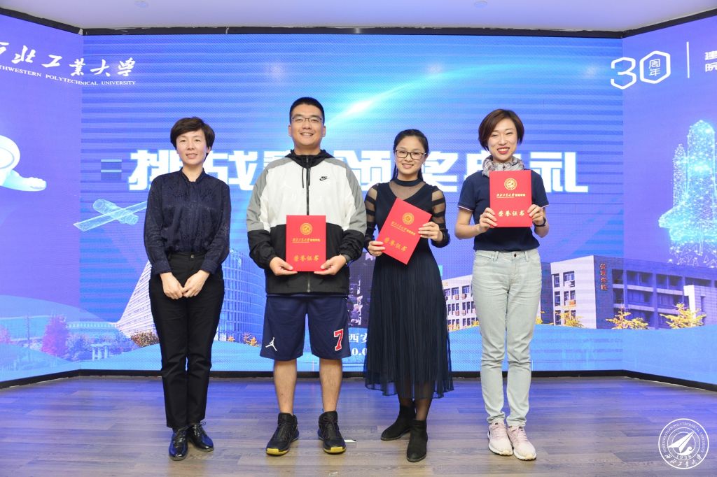党委书记乔彩燕为2020年在挑战赛中取得优异成绩的同学颁奖,翱翔队队长李浩同学将旗帜交予新任队长黎锦禄同学,标志着挑战赛的火种已点燃,预祝西工大翱翔队在赛场上取得更好成绩。