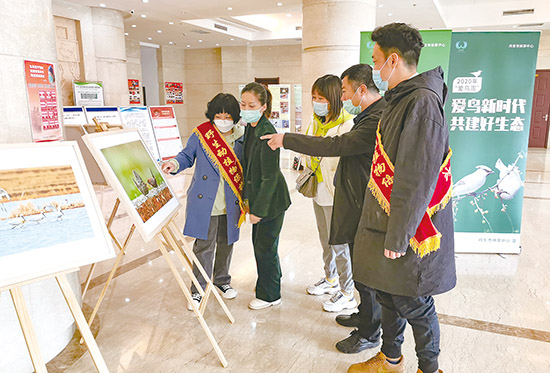 4月22日是世界地球日,也是辽宁省第39届“爱鸟周”的起始日。丹东市林草发展服务中心围绕“爱鸟新时代,共建好生态”开展了系列宣传活动。图为该中心野保工作人员在机关大楼里开展鸟类知识科普展和鸟类摄影作品展。